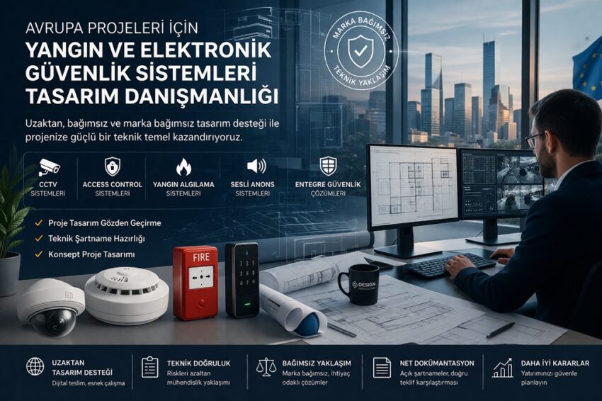 Avrupa’daki projeleriniz için uzaktan yangın ve elektronik güvenlik sistemleri tasarımı, teknik şartname hazırlığı veya proje değerlendirme desteği almak için bizimle iletişime geçebilirsiniz.
